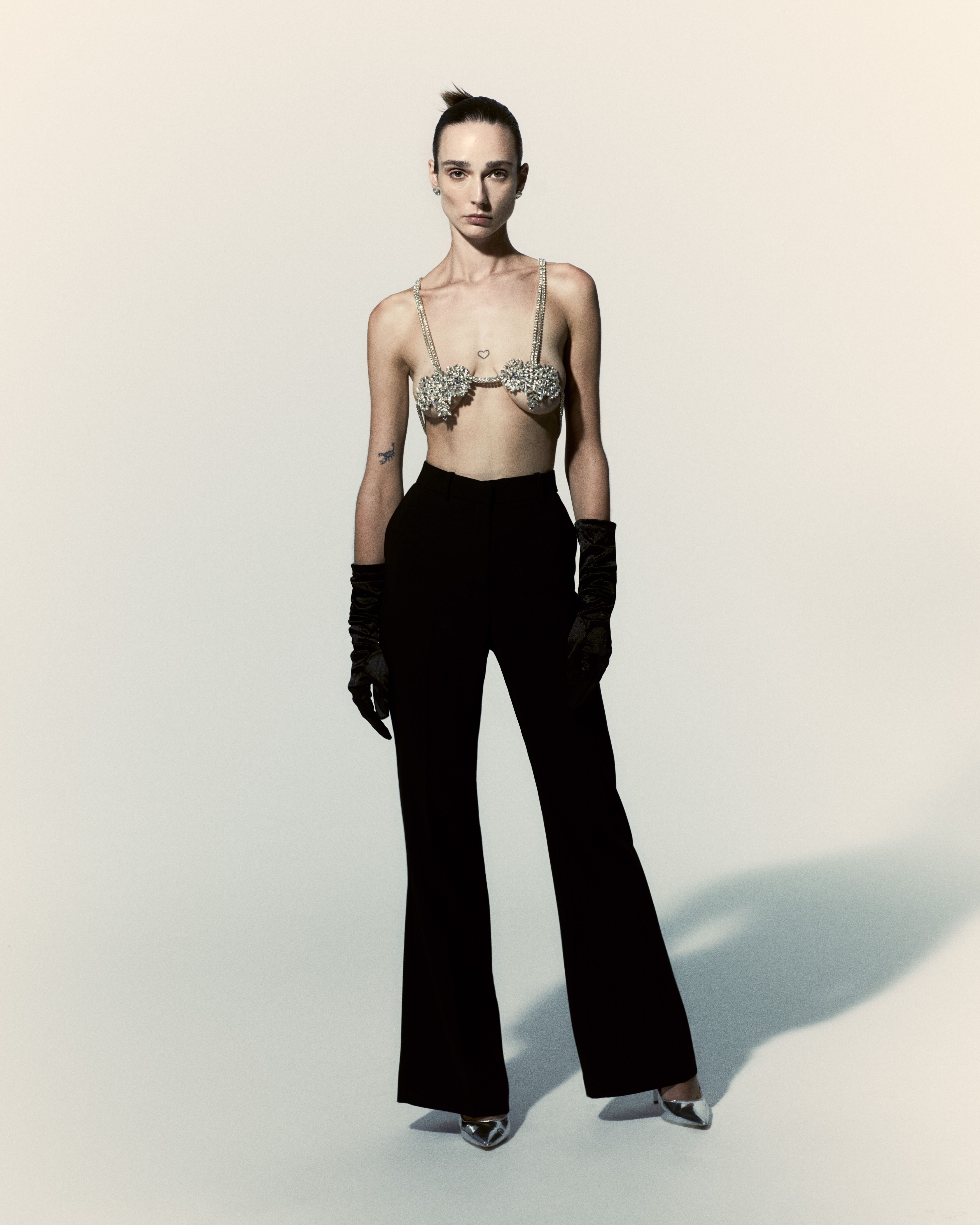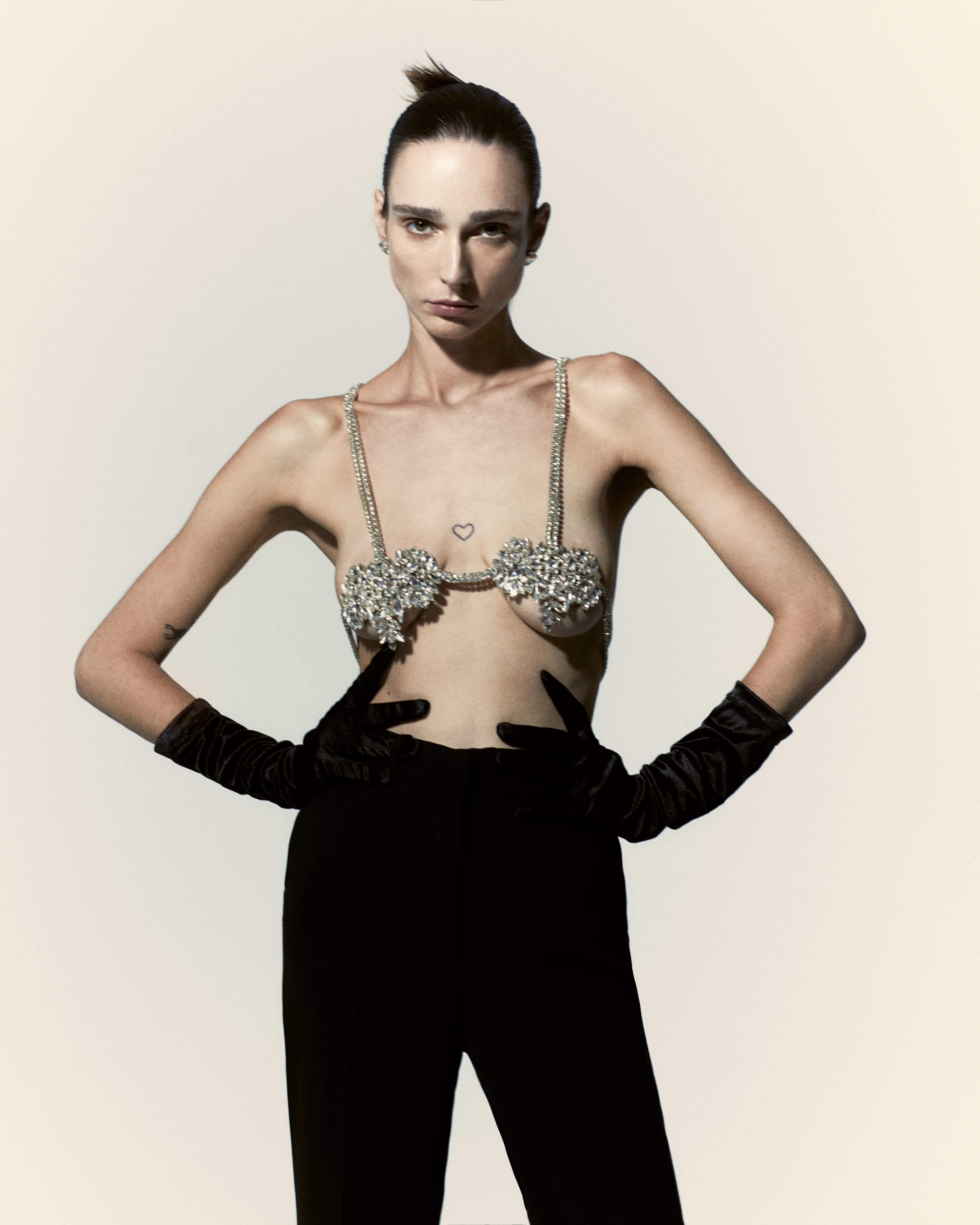 The Paradis Top exemplifies elegance with its detailed metal and glass rhinestones, handcrafted to ensure a refined and exclusive design. Inspired by the form of a heart adorned with paradise symbols like flowers and leaves, each top is unique and reflects Aqua Paradis's commitment to quality and craftsmanship.