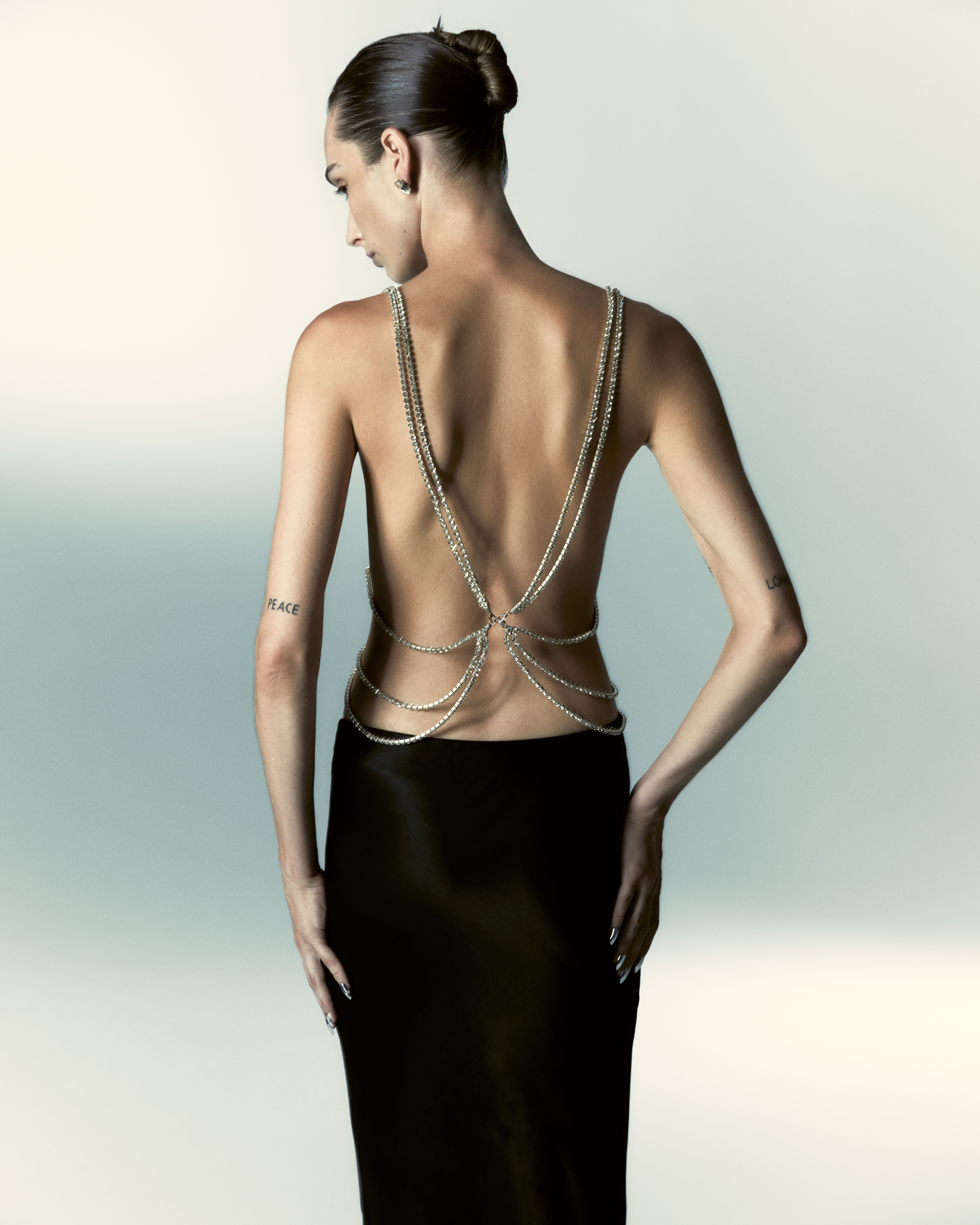 The Syren Top offers a bold design with distinctive metal and glass rhinestones, meticulously handcrafted to make a striking statement. Each piece is