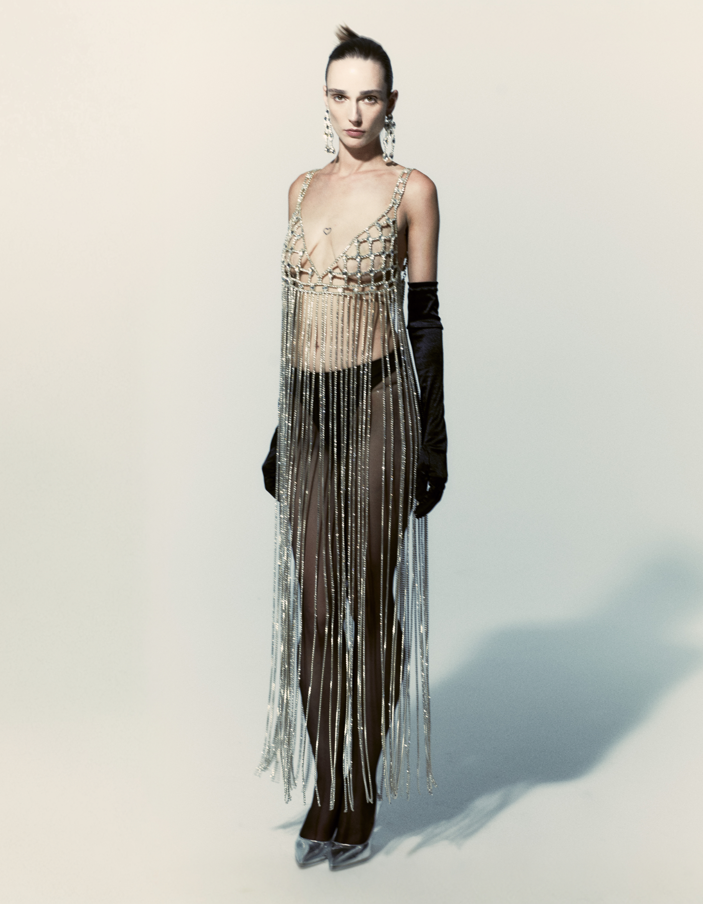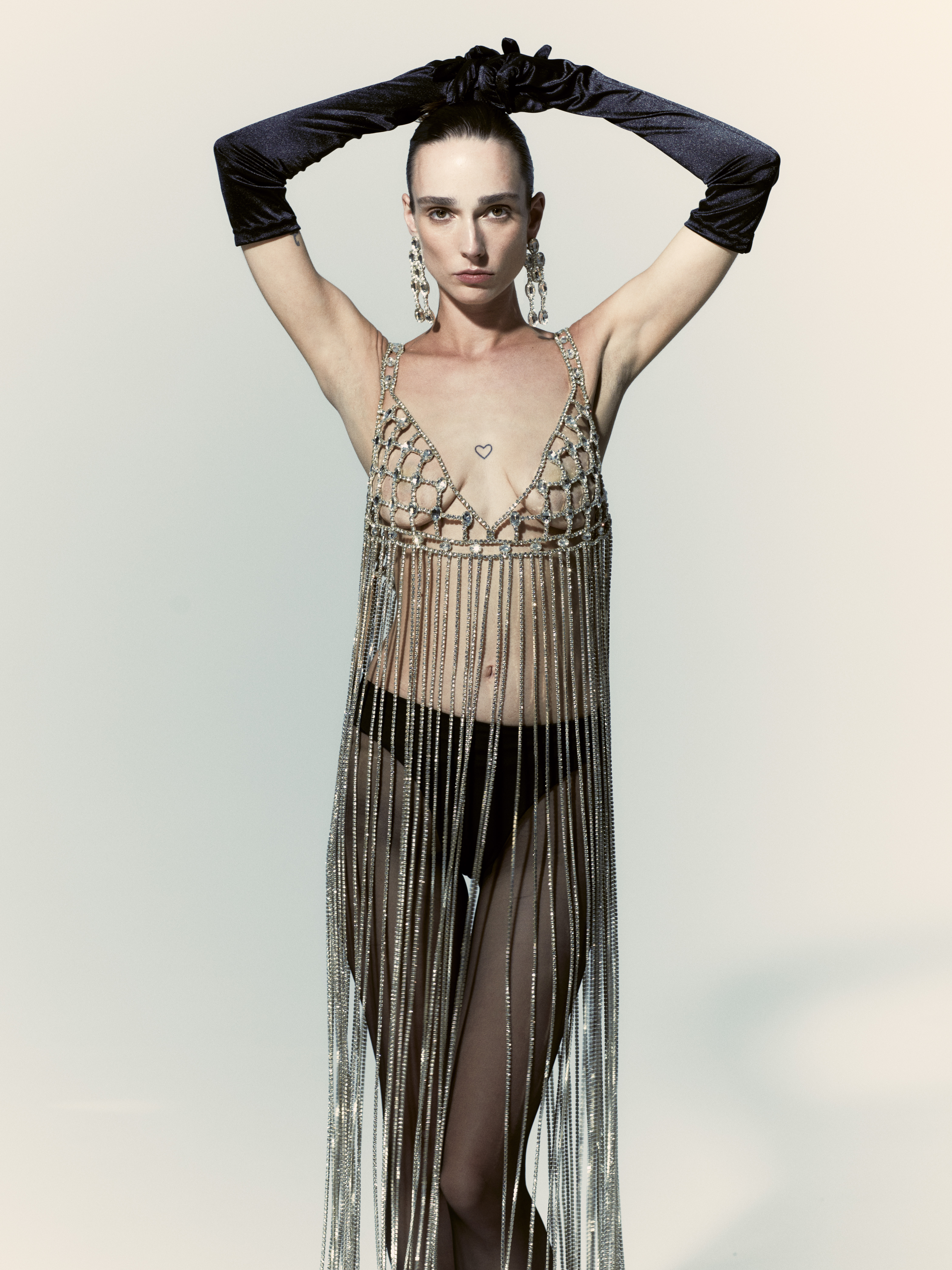 Inspired by water's unpredictable movements, the Venus Dress features exrtra long sparkly fringes and bold metal and glass rhinestones, handcrafted to create a statement piece with exceptional glamour. This dress is designed to stand out, reflecting Aqua Paradis's commitment to quality and unique design.